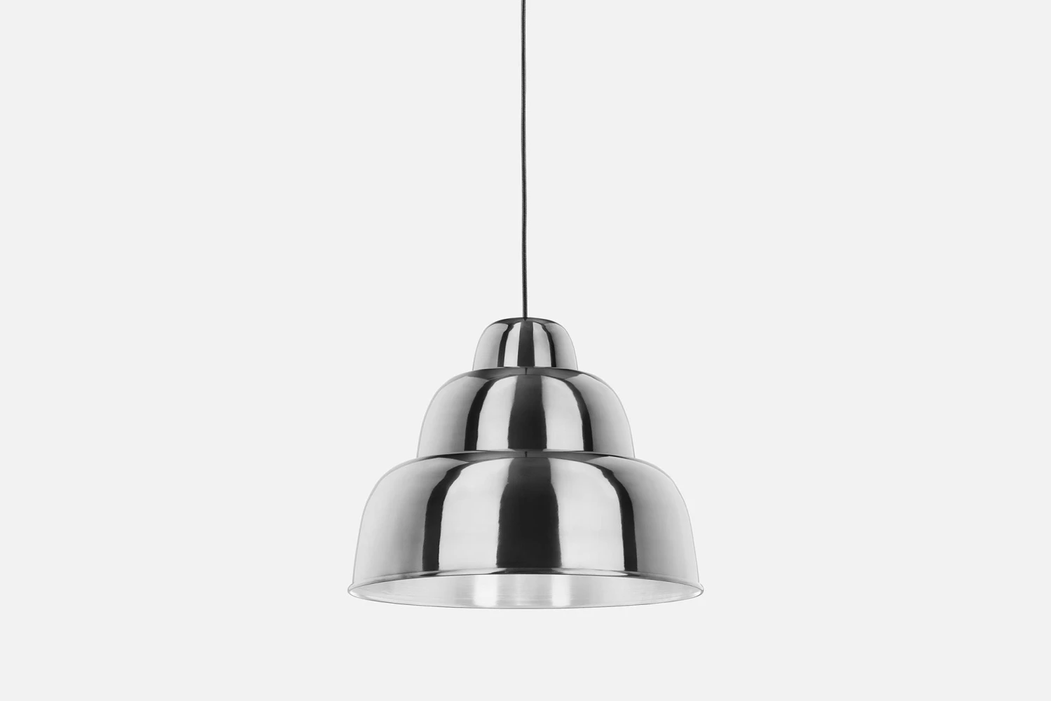 The Levels lamp’s bold, rounded shades are made by pushing spun metal sheets around a rotating mandrel until they achieve perfect form. The shades are then folded to allow the three differently sized pieces to hang from one another. This creates not only a cascading, tiered effect but allows the shades to be stacked inside one another for ease of transportation and, as ever with designers Form Us With Love, no tools are required for assembly. The fabric-covered cable provides a contrasting flourish.