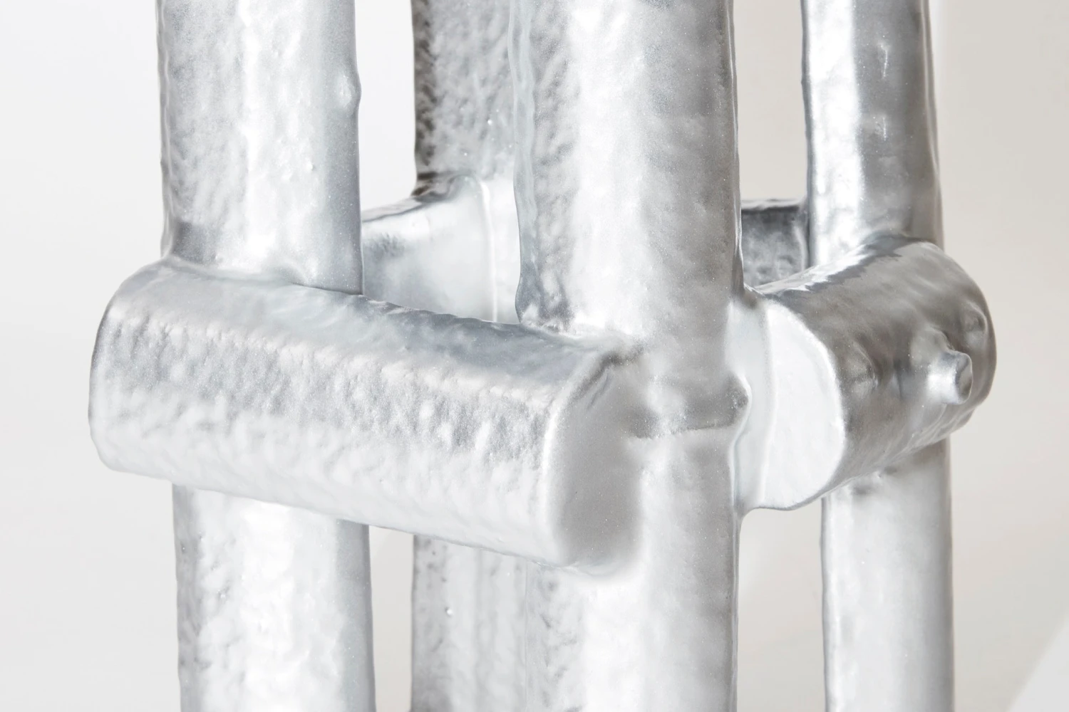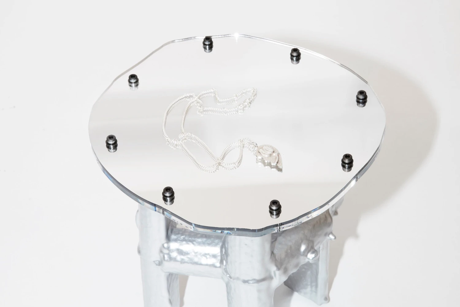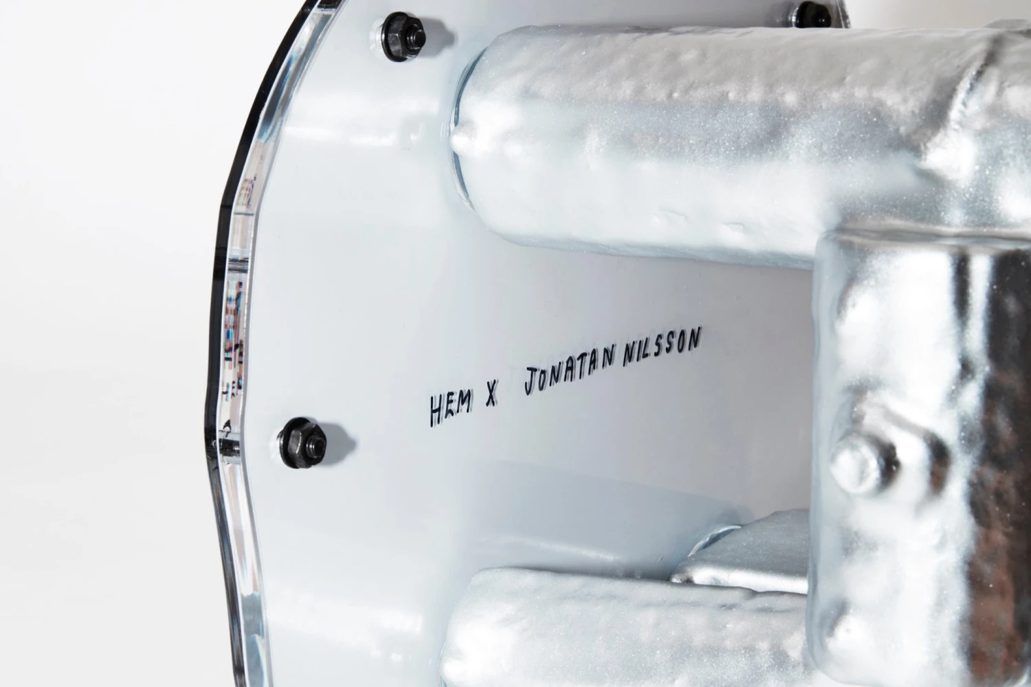 Designed and hand-made by Jonatan Nilsson, Power Plinth is a confident statement piece unlike any other. This chunky, pearlescent, silvery plinth is made from resin-covered styrofoam and mirror acrylic sheets, juxtaposing density and porosity, embodying the artist’s curiosity for materials. Power Plinth can act as a pedestal for your most precious belongings, or as a sculptural and striking stand-alone piece.