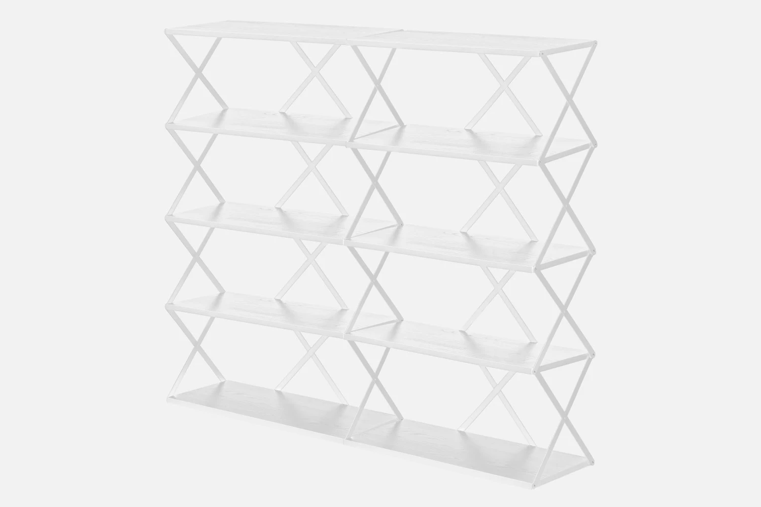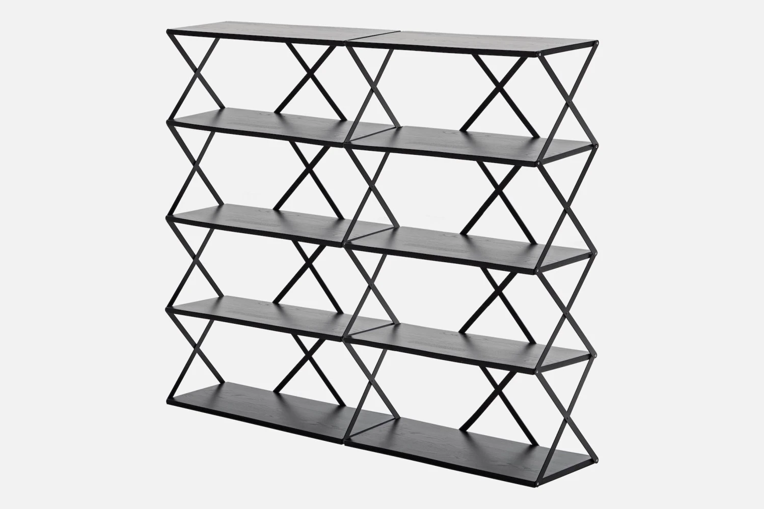 Staffan Holm’s Lift Shelf effortlessly and elegantly expands to accommodate your ever-growing collections. Extra shelves can be stacked on top of or alongside an existing system for additional capacity, making this modular solution as flexible as it is handsome. The construction is economical and functional, just like the industrial scissor lifts that inspired its fundamental form. It consists of only two components: welded metal cross-shaped supports and wooden boards. The Lift Shelves are shipped flat-packed and can be assembled without tools.